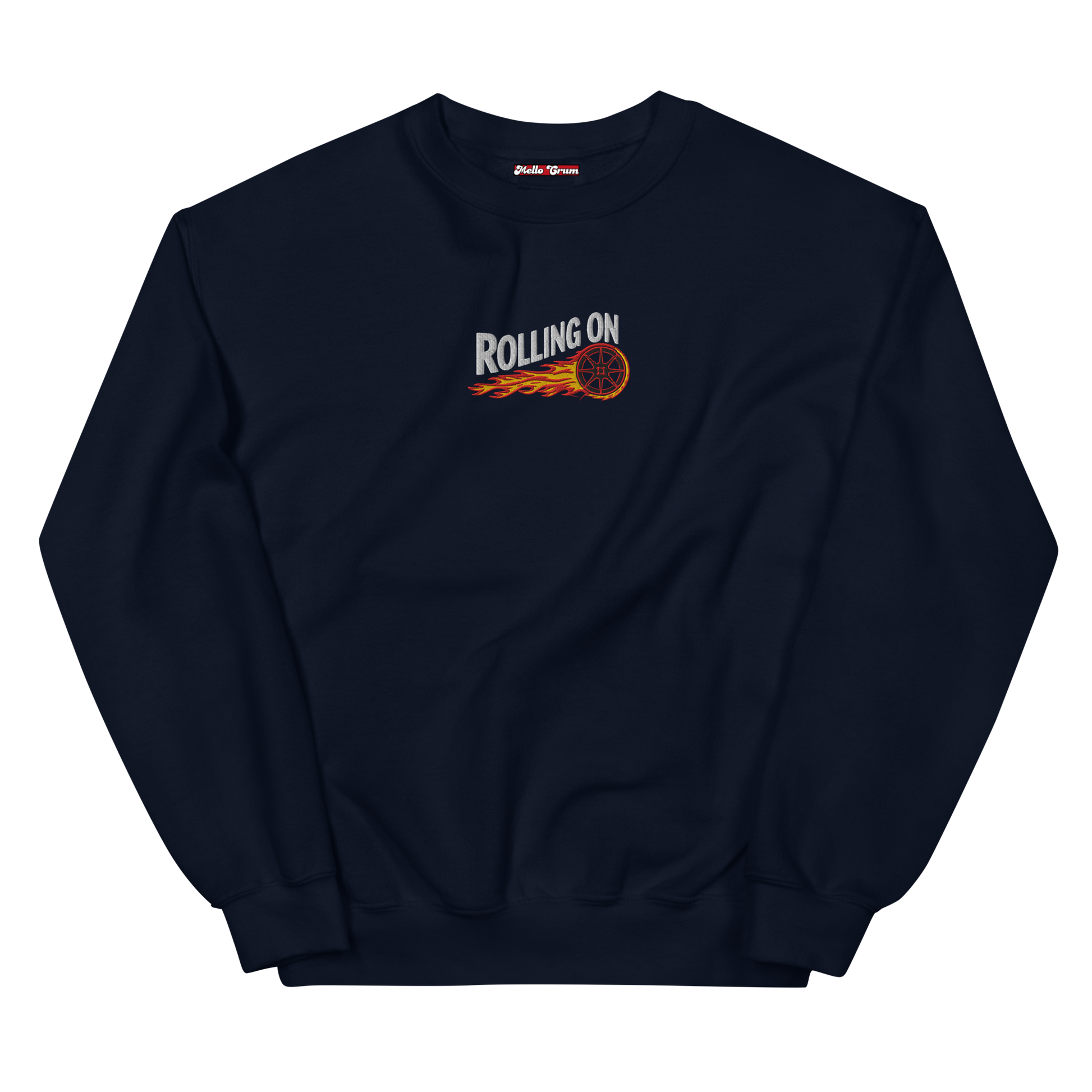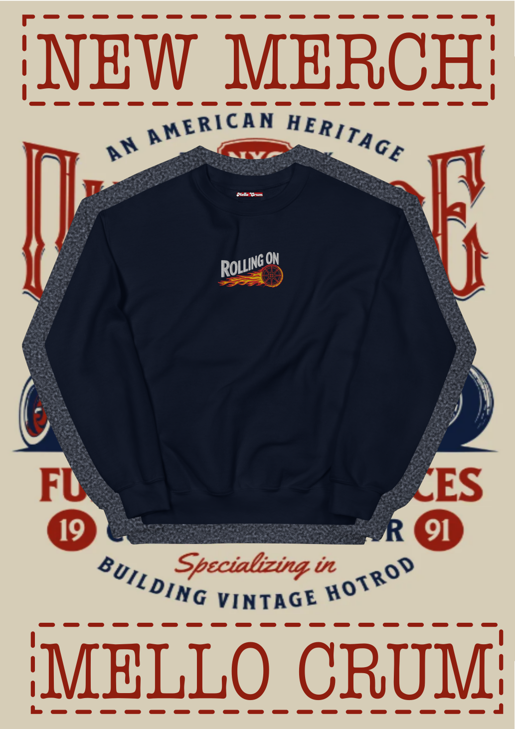 design with large embroidered "rolling on" logo on front, with additional "mello crum" custom logo printed inside. includes big flaming wheel on fire.